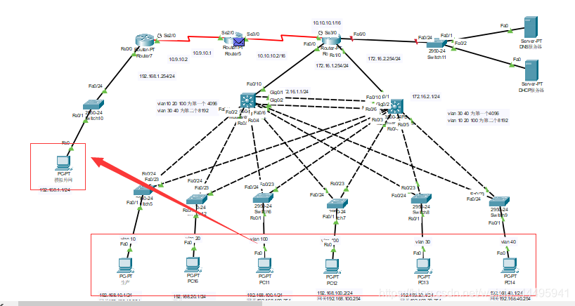 如图,想要将下面一排的主机ping通上面的模拟外网主机,我在中间的两台三层交换机上面配置了有PVST指定的左边第一个三层为根交换机,这样所有的路由会通过根交换机来转发。其中全局配置的为ospf动态路由,且根交换机上有路由表完善。