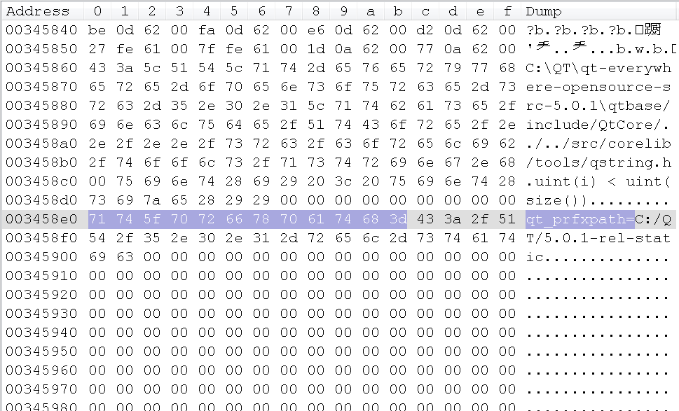 是不是改完就OK了呢?别急,会不会还有其它地方也记录了路径信息呢?查找43 3a 2f 51 54 2f 35 2e 30 2e 31 2d 72 65 6c 2d 73 74 61 74 69 63 (C:/QT/5.0.1-rel-static),发现一共有17处路径,依次修改,保存。再试试,问题解决啦。