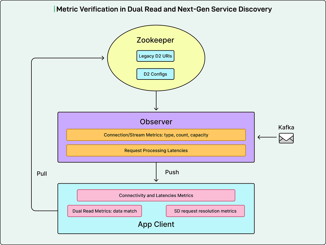 LinkedIn built comprehensive metrics to verify connectivity, performance, and data correctness on both the client side and Observer side. On the client side, connectivity and latency metrics watched for connection status and data latencies from when the subscription request was sent to when data was received. Dual Read metrics compared data received from Zookeeper and Next-Gen Service Discovery to identify mismatches. Service Discovery request resolution metrics showed request status, identical to Zookeeper-based metrics, but with a Next-Gen Service Discovery prefix to identify whether requests were resolved by Next-Gen Service Discovery data and catch potential errors like missing critical data.