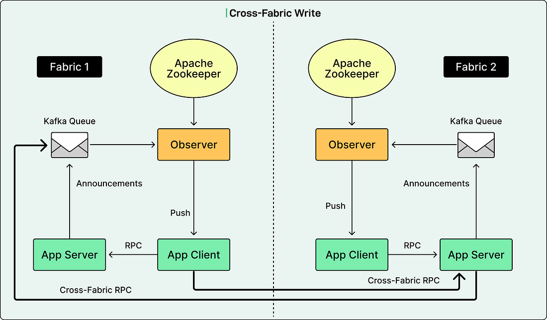 Application servers can also write to the control plane in multiple fabrics. Cross-fabric announcements are appended with a fabric name suffix to differentiate from local announcements. Application clients can then send requests to application servers in both local and remote fabrics based on preference.