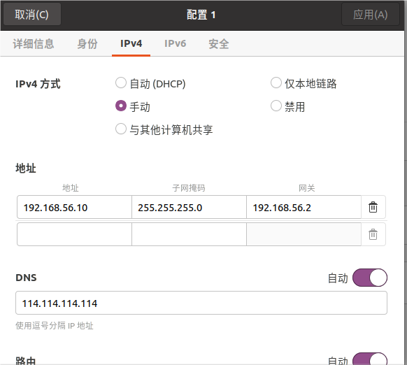 (9)修改Ubuntu网络配置。在“设置”-“网络”-“以太网”-“IPv4”中设置,这里可以新配置一个有线网络。
