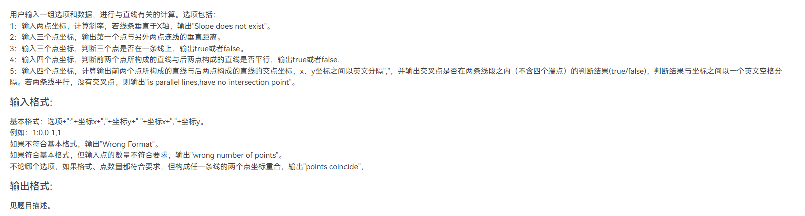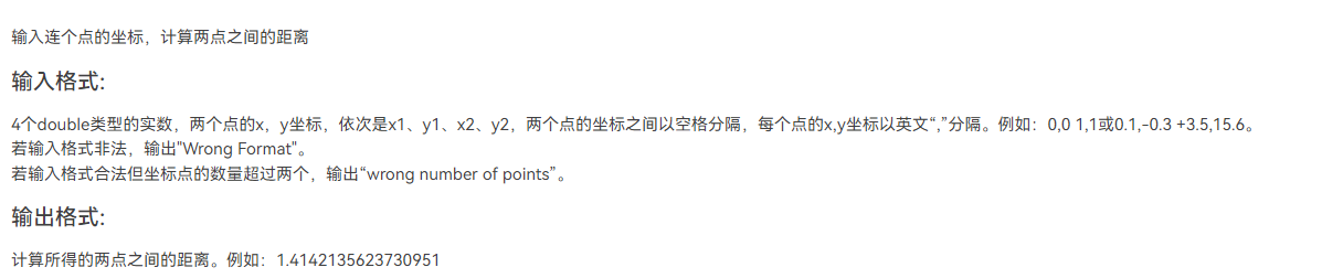 总结:这道题的题目要求很简单,就是计算两点间距离,但是它对数据输入输出的格式有很高的要求,如果输入数据不符合坐标形式,程序就要报错提醒,并且也需要格外注意坐标点数量。由于输入数据中包含空格以及逗号,我们输入时应选择字符串输入,并要对数据进行校验。在做好对输入数据的校验后,我用数组进行存放数据,最后通过距离公式来进行计算。此外,本题可以设计一个点类来完成。