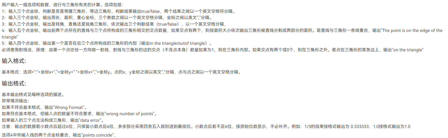 3.在计算上不是数学上的范围,例如判断直角三角形,应该是两边平方和减第三边平方小于一个极小值,而不是等于0,题目中就有一个测试点是关于此的,我改了很久。