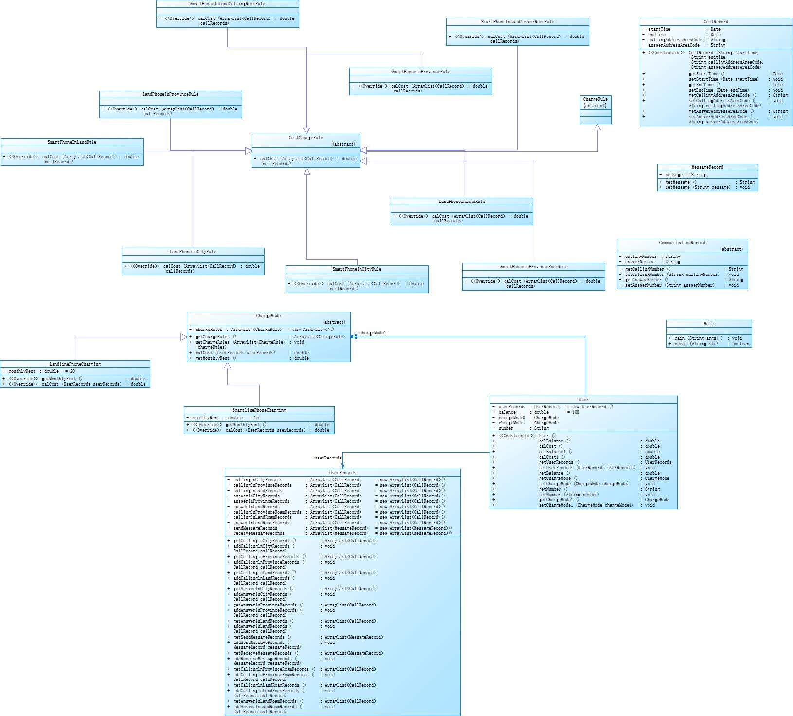 后续题目集将增加手机用户,手机用户的计费方式中除了与座机计费类似的主叫通话费之外,还包含市外接听电话的漫游费以及发短信的费用。在本题的设计时可统一考虑。