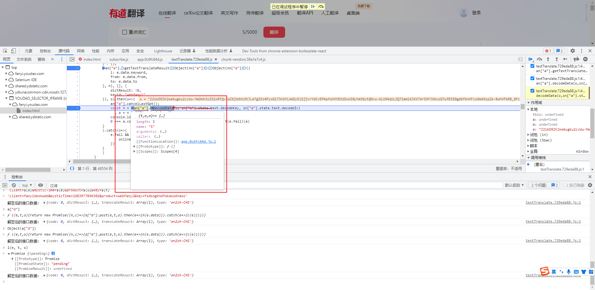 an["a"].getTextTranslateResult(Object(nn["a"])(Object(nn["a"])({ i: e.data.keyword, from: e.data.from, to: e.data.to }, n), {}, { dictResult: !0, keyid: "webfanyi" }), o).then(o=>{ an["a"].cancelLastGpt(); const n = an["a"].decodeData(o, sn["a"].state.text.decodeKey, sn["a"].state.text.decodeIv) , a = n ? JSON.parse(n) : {}; console.log("解密后的接口数据:", a), 0 === a.code ? e.success && t(e.success)(a) : e.fail && t(e.fail)(a) } -