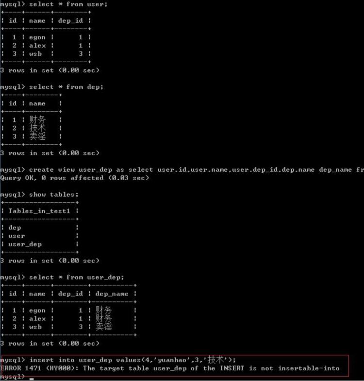 mysql> update course_view set cname='xxx'; #更新视图中的数据