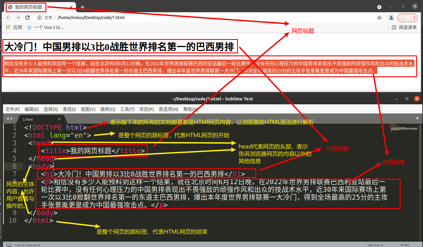 1-html-第一个网页.html,代码:<!DOCTYPE html> <html lang="en"> <head> <meta charset="UTF-8"> <title>我的网页标题</title> </head> <body> <h1>内容的标题</h1> <p>文章内容等</p> </body> </html><!DOCTYPE html> <html lang="en"> <head> <meta charset="UTF-8"> <title>我的网页标题</title> </head> <body> <h1>大冷门!中国男排以3比0战胜世界排名第一的巴西男排</h1> <p>相信没有多少人能预料到这样一个结果,就在北京时间6月12日晚,在2022年世界男排联赛巴西利亚站最后一轮比赛中,没有任何心理压力的中国男排表现出不畏强敌的顽强作风和出众的技战术水平,近30年来国际赛场上第一次以3比0掀翻世界排名第一的东道主巴西男排,爆出本年度世界男排联赛一大冷门,得到全场最高的25分的主攻手张景胤更是成为中国最强攻击点。</p> </body> </html>