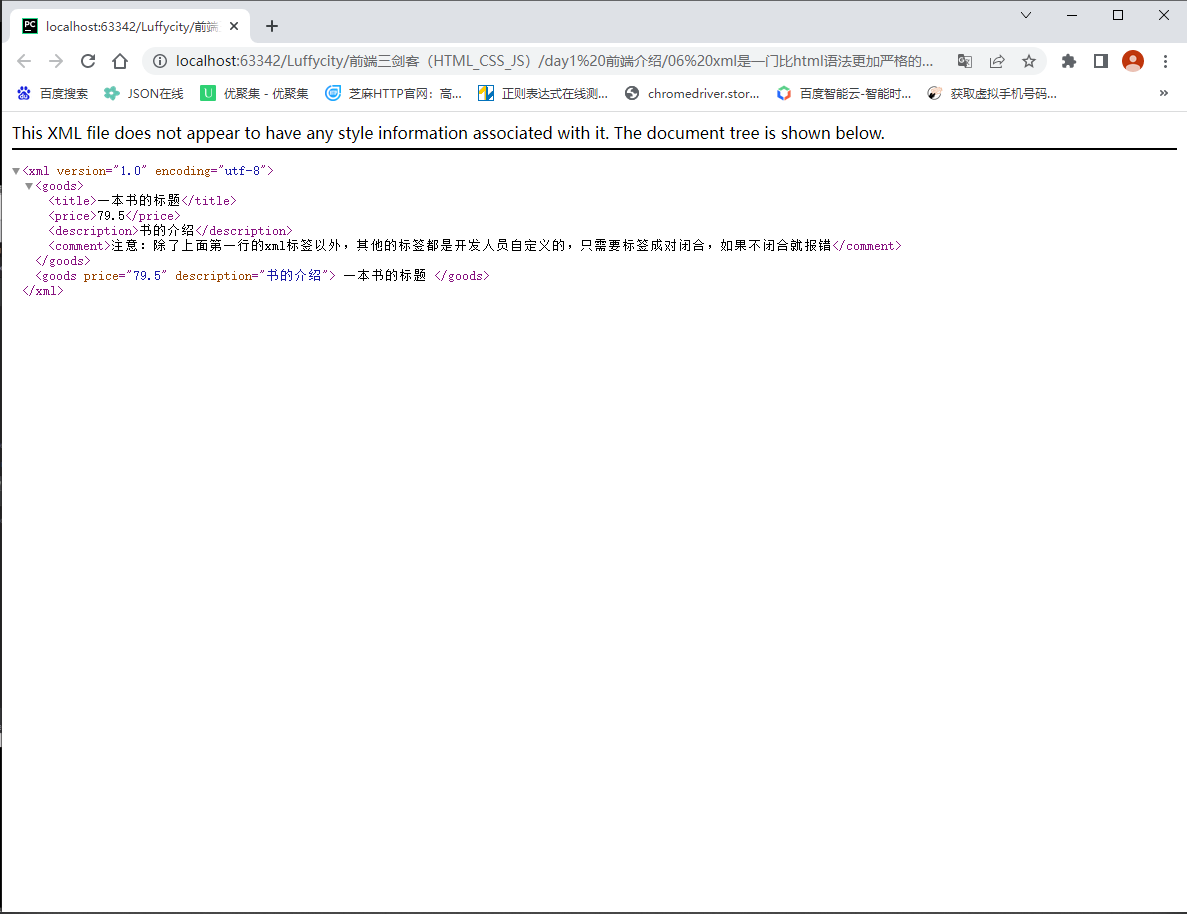 <xml version="1.0" encoding="utf-8" > <goods> <title>一本书的标题</title> <price>79.5</price> <description>书的介绍</description> <comment>注意:除了上面第一行的xml标签以外,其他的标签都是开发人员自定义的,只需要标签成对闭合,如果不闭合就报错</comment> </goods> <goods price="79.5" description="书的介绍"> 一本书的标题 </goods> </xml>