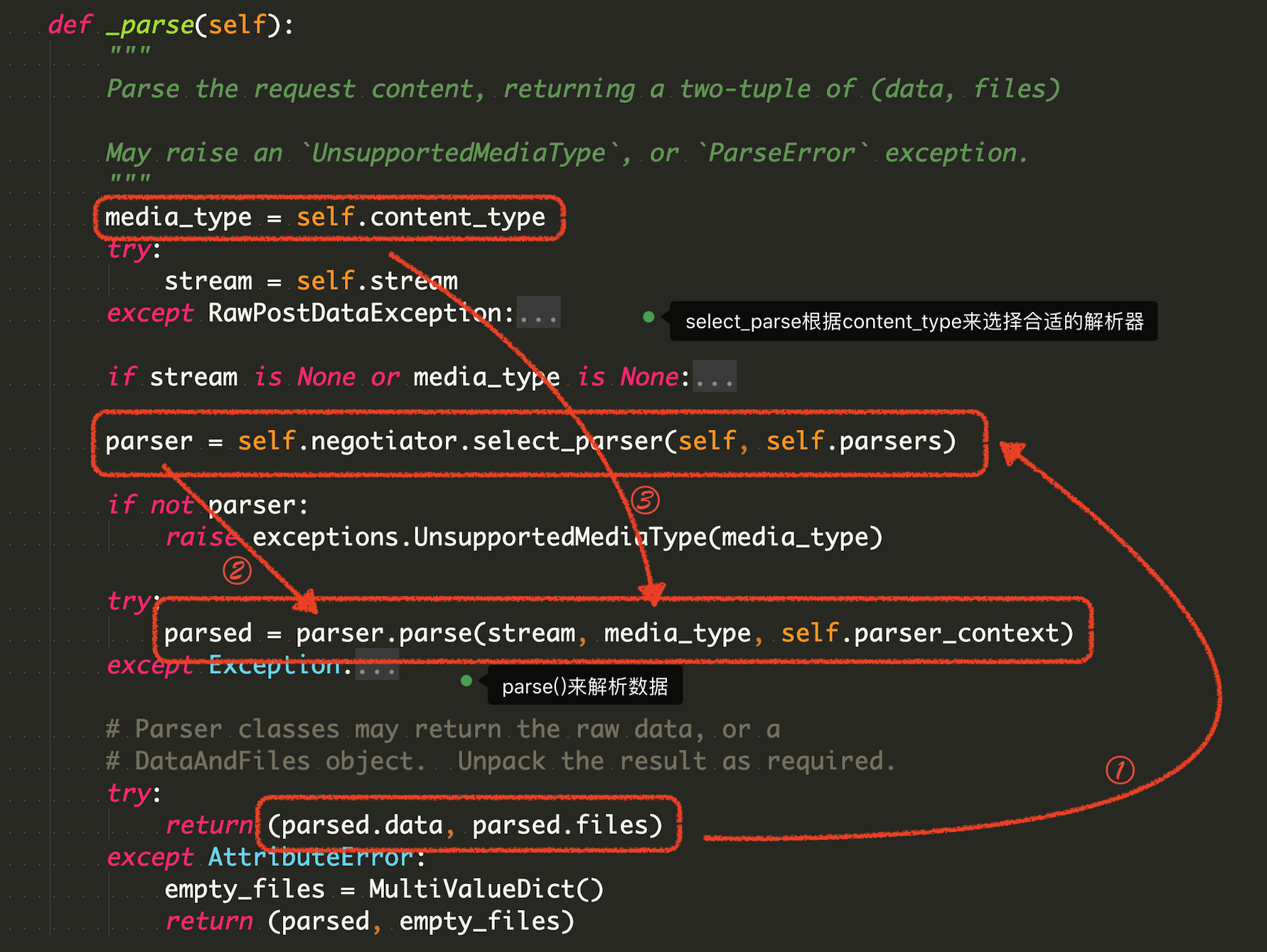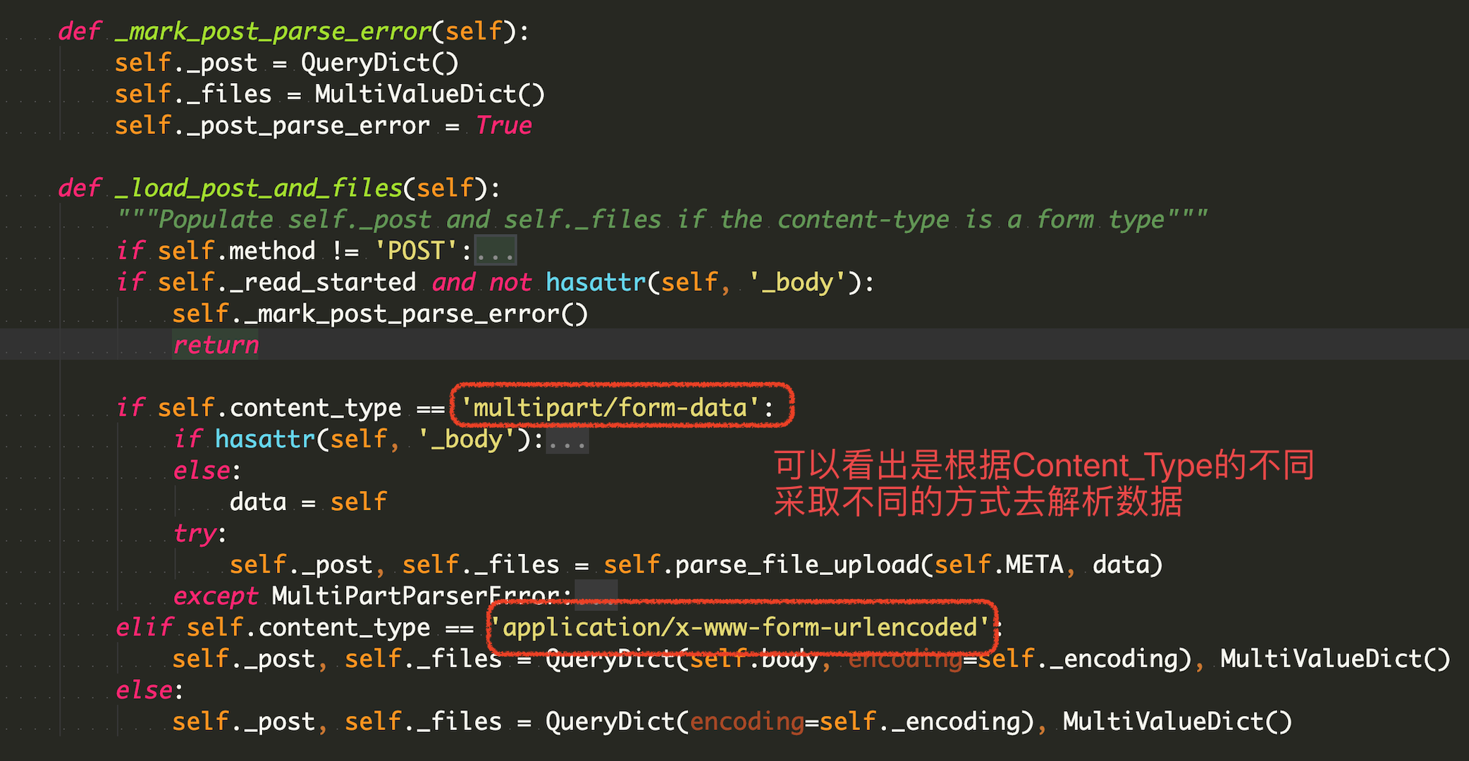 - 此时我们回想在Django的视图中通过request.POST和request.FILES能够取到数据都是因为在这里把请求的数据解析,并赋值给request对象了。