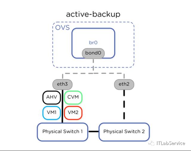 主备模式,这是AHV的默认负责均衡策略。也就是2块万兆网卡只有1块有流量通过,另外1块万兆网卡无任何流量通过,只有在活动的网卡出现故障时,备用网卡才会成为活动网卡承载网络流量,不需要在交换机进行任何配置,但是使用率只有50%。具体如下图所示。