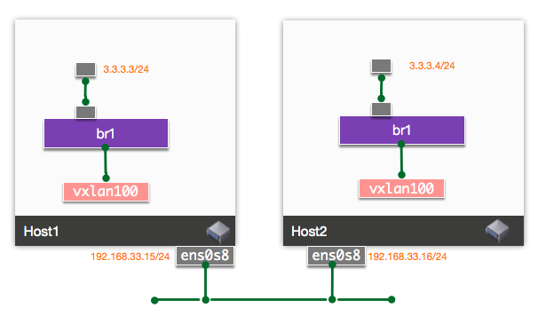 下面我们通过实例来手动更新FDB表来实现VXLAN通信。我们的实验环境如下图, VTEP本地使用Linux bridge来挂载连接到network namespace中的veth pair虚拟网卡,我们要实现3.3.3.3二层访问3.3.3.4。