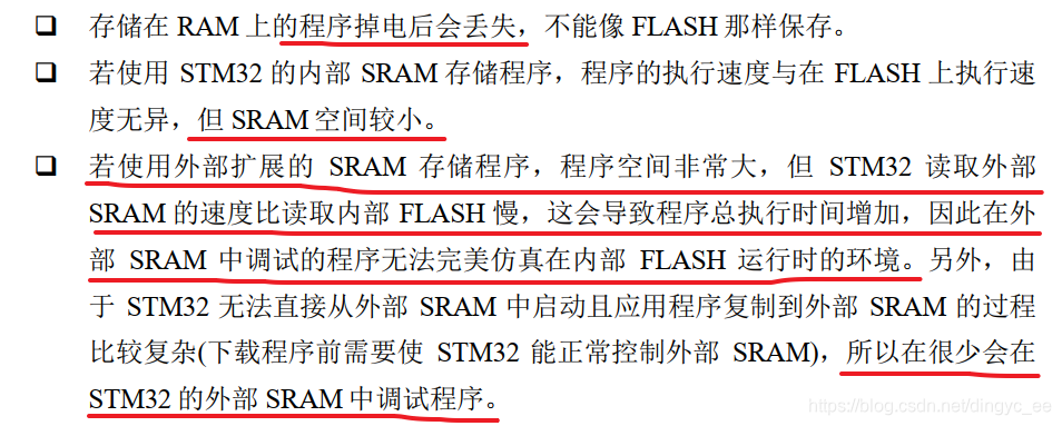 (6)若使用外部扩展的 SDRAM 存储程序,程序空间非常大,但 STM32 读取SDRAM 的速度比读取内部 FLASH 慢,这会导致程序总执行时间增加,因此在SDRAM 中调试的程序无法完美仿真在内部 FLASH 运行时的环境。另外,由于STM32 无法直接从 SDRAM 中启动且应用程序复制到 SDRAM 的过程比较复杂(下载程序前需要使 STM32 能正常控制 SDRAM),所以在很少会在 STM32 的SDRAM 中调试程序。