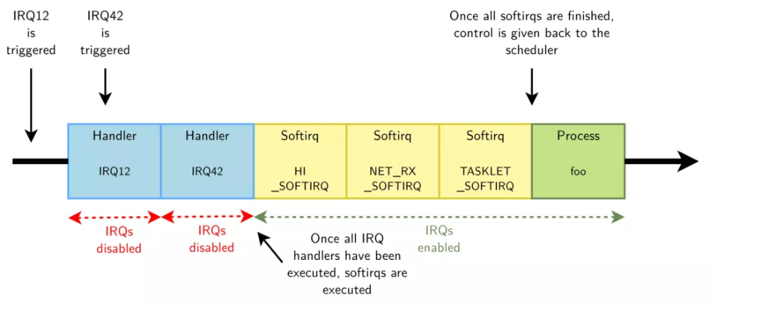 但是,现实情况是,许多 ISR 有大量工作要执行。例如网络设备的 ISR 除了响应硬件之外,还需要 将网络数据包从硬件复制到内存中,处理它们,并将数据包向下分发到适当的协议栈或应用程序。