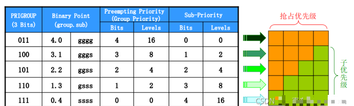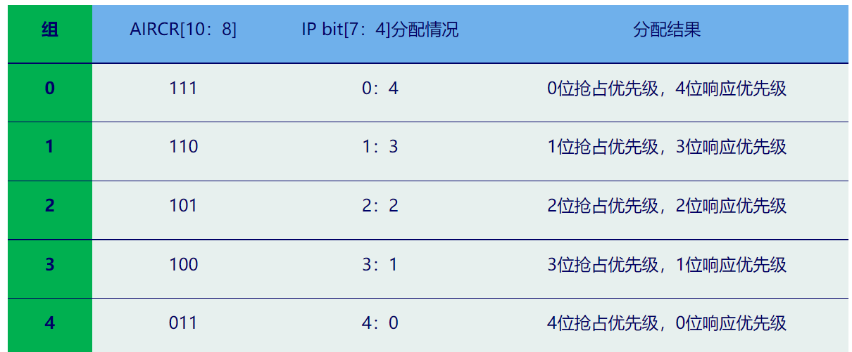 分组配置是在寄存器SCB->AIRCR中配置,具体的分配关系如下所示: