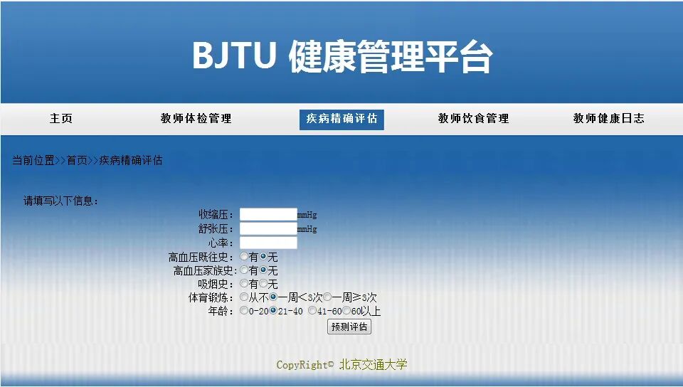 随着网络技术的不断发展,网站的开发与运用变得更加广泛。这次采用java语言SSH框架(Spring,Struts,Hibernate)设计并实现了面向特定群体的健康管理平台。该网站主要有教师饮食管理、教师健康日志、教师体检管理、疾病预测评估等功能模块。通过该网站,教师可以更好的关注自己的体检状况以及最近的身体状况,根据自身情况调整饮食,睡眠等生活习惯,并且可以及时预测高血压以及糖尿病的患病可能性大小,以便采取有效地预防措施。