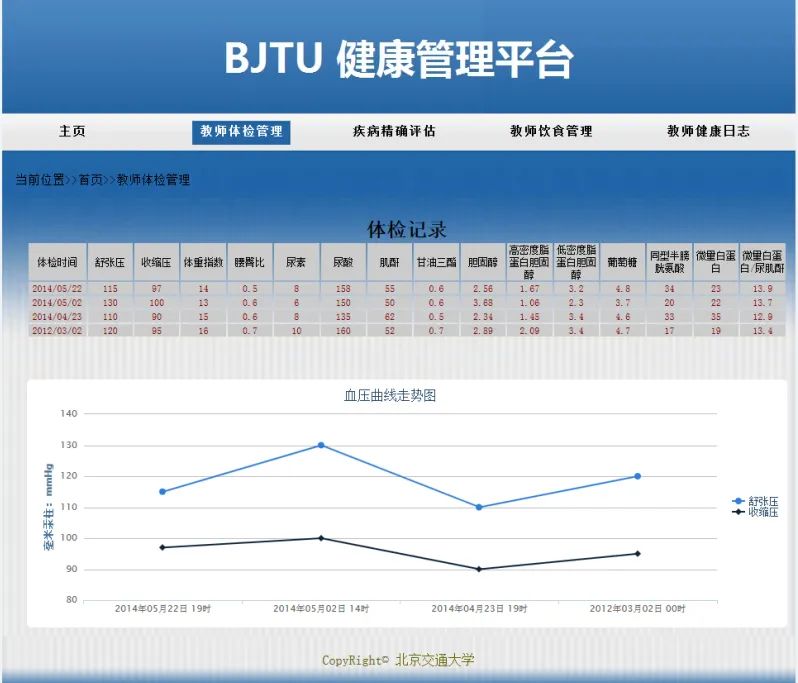 3.教师体检管理:教师可通过该平台查询每次的体检结果,显示部分项目随时间变化的曲线。