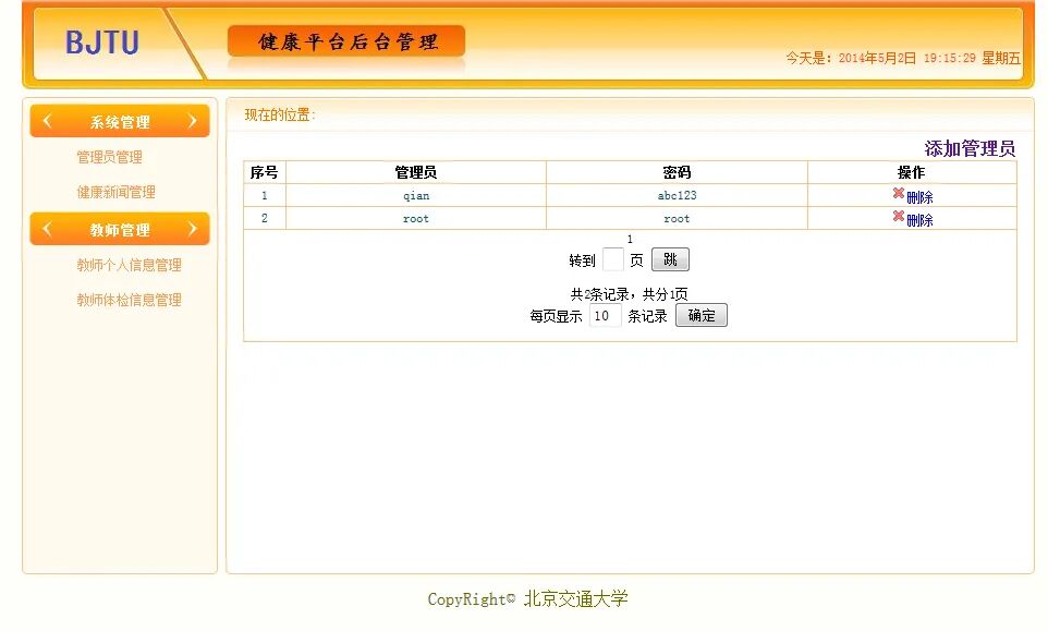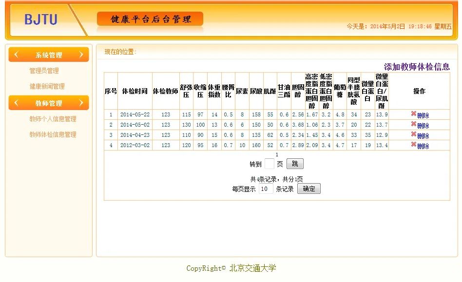 3.管理员管理体检结果:可以增删改查教师体检记录。