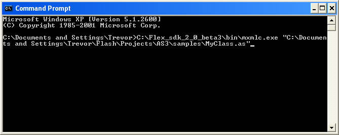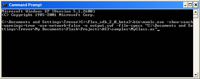 When running mxmlc.exe, you'll need to supply it with at least (and usually) one ActionScript 3 file to compile. This file serves as the primary application file for the published SWF. Any other external ActionScript 3 files this application file imports or references will automatically be compiled into the resulting SWF. Unlike the Flash authoring environment or Flex Builder, though, mxmlc.exe has no GUI (graphical user interface); it is a command line tool. Trying to run it by double clicking and opening the EXE will cause a command prompt to pop up which will do some quick evalutation and immediately close. For it to work, it needs an ActionScript (or MXML) file to compile. To do this you have a couple of options.