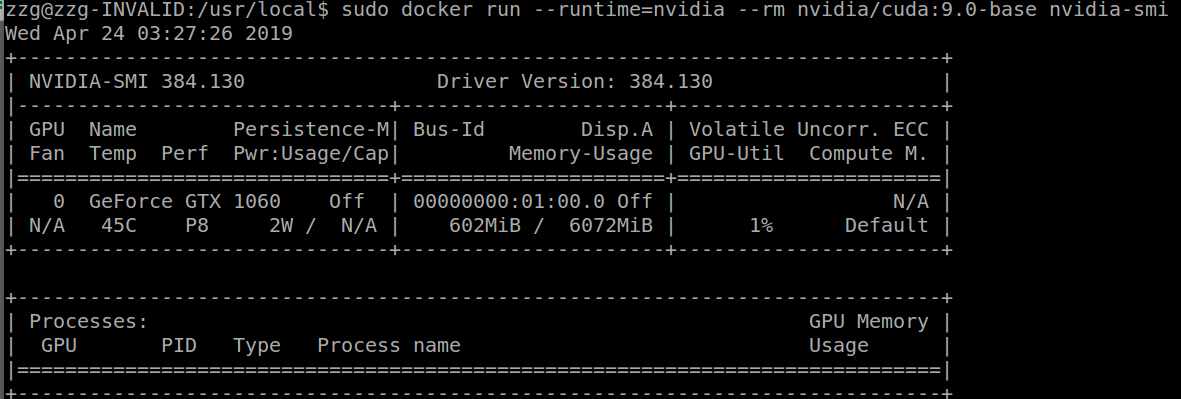 sudo docker run --runtime=nvidia --rm nvidia/cuda:9.0-base nvidia-smi