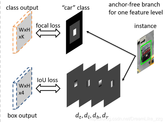 先用anchor-free方法在特征图上大概检测一下,看看哪层效果好(损失函数最小),就将instance交给那层特征对应的anchor-based来处理。anchor-free branch预测是基于特征点的,不用anchor。