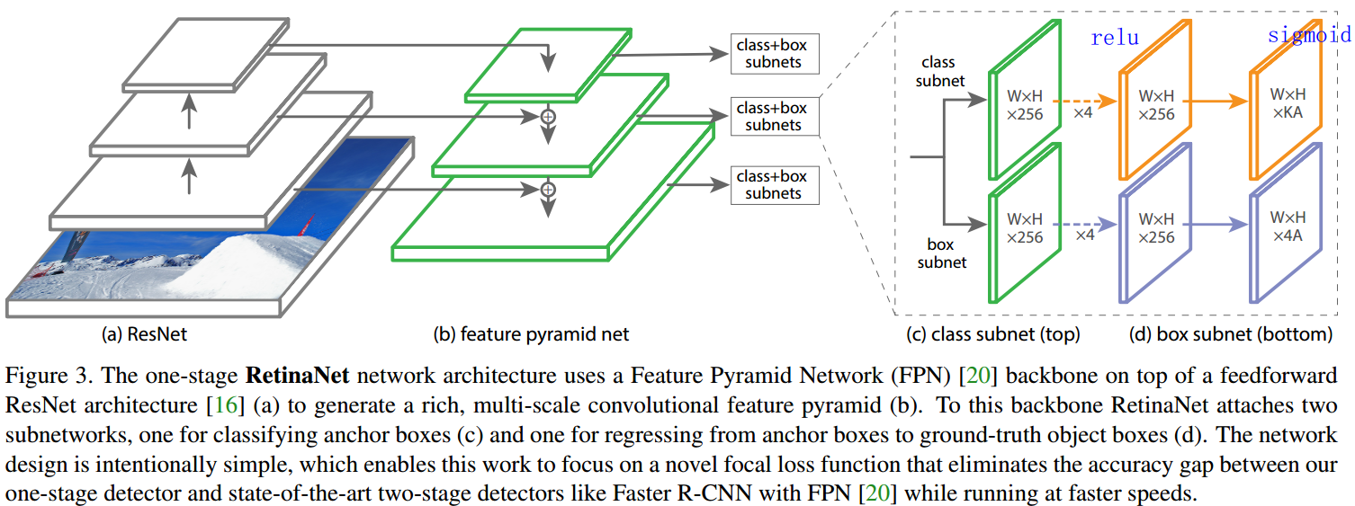 Author designs a simple one-stage object detector called RetinaNet, based on a ResNet-101-FPN backbone, achieves a COCO test-dev AP of 39.1 while running at 5 fps. Box regression subnet and the classification subnet share a common structure, but use separate parameters.