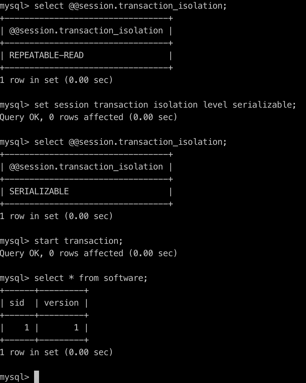 1,创建第一个mysql连接,设置当前会话的隔离级别为 serializable;开启一个事务A,查看software表中有一条记录;
