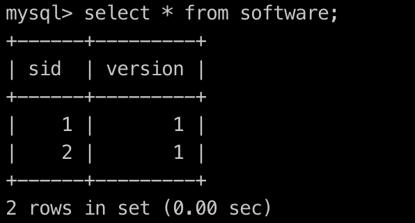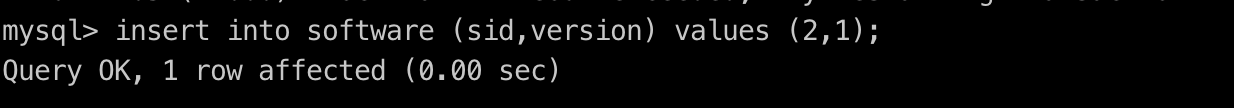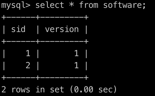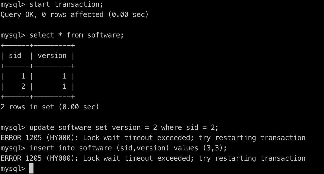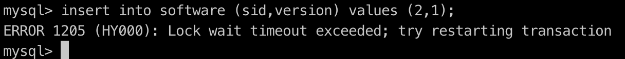 5.事务A重新执行插入一条记录:insert into software (sid,version) values (2,1);