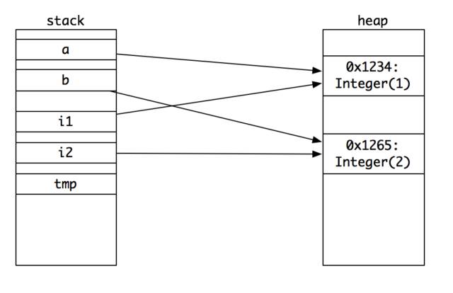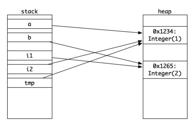 在我们的main函数里,有两个对象变量a和b,他们分别指向堆上的两个Integer对象,地址分别为:0x1234和0x1265,值分别为1和2。在java里,Object a = new Object()这句话执行类似于c++里面的CObj* c = new CObj(),这里a和c实际都是指针(java称做引用),a和c的值,实际是一个内存地址,而不是1、2、3这样的具体的数字。