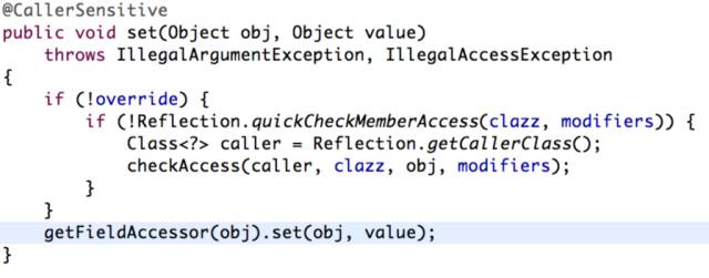 我们来看看这个函数的原型吧:public void set(Objectobj, Object value) 他需要的传入参数是两个Object,而我们传入的是什么呢? Integer的i1,和int的i2.intValue()。对于第一个参数,是完全没问题的;而第二个参数,编译器又给我们做了一次装箱,最终转化出来的代码就像这样: