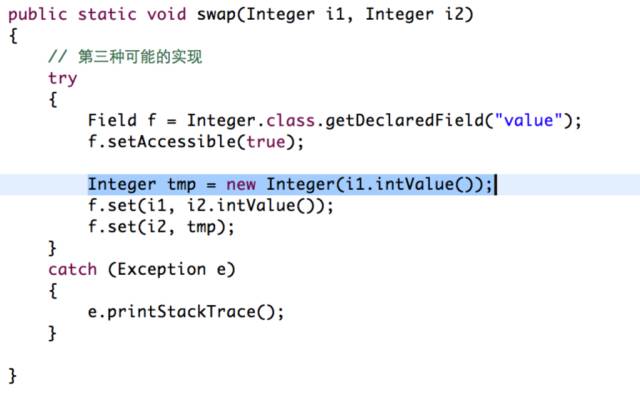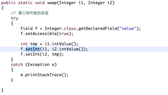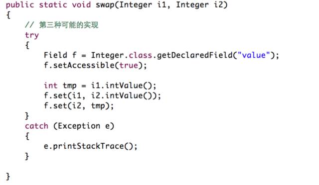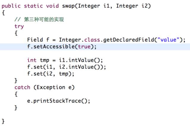 这个函数的入参:i1和i2分别指向a和b对应的内存地址,这个时候,将i1的值(也就是value)传递给int型的tmp,则tmp的值为整数值1,然后我们想把i2的整数值2设置给i1:f.set(i1, i2.intValue()); 这个地方看起来很正常吧?