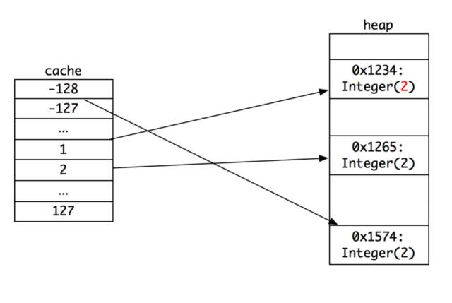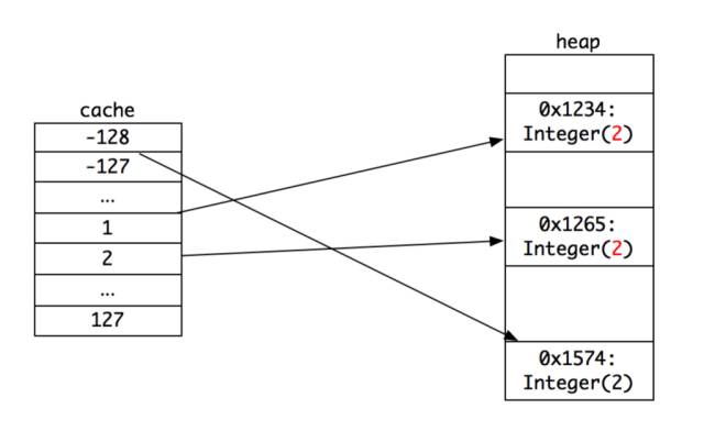 这是IntegerCache的实现,默认在-128和127之间的数,一开始就被新建了,所以他们只有一个实例。老王画了下面的示意图(为了让大家看的清楚,没有画完所有的内存)