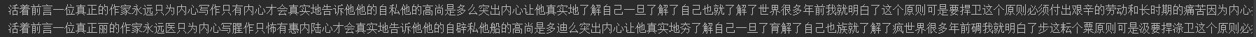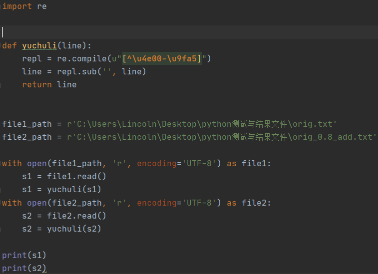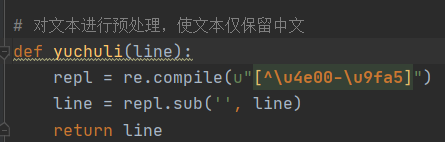 在翻看txt文件的时候可以发现,其除了汉字以外还包括了标点符号等不需要进行分词比较的部分。所以我利用正则表达式先对文本进行预处理,将文本中除中文外的所有字符全部去除,利用了如下代码: