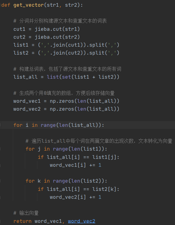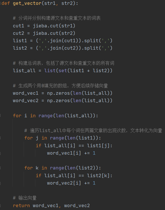 文本转向量,首先将预处理之后的文本进行分词处理,并将处理后的词全部组成一个词包,里面包括了源文本以及查重文本的所有词。接着计算词频,利用循环算出词包中每个词在两篇文章中出现的次数并作为向量储存。