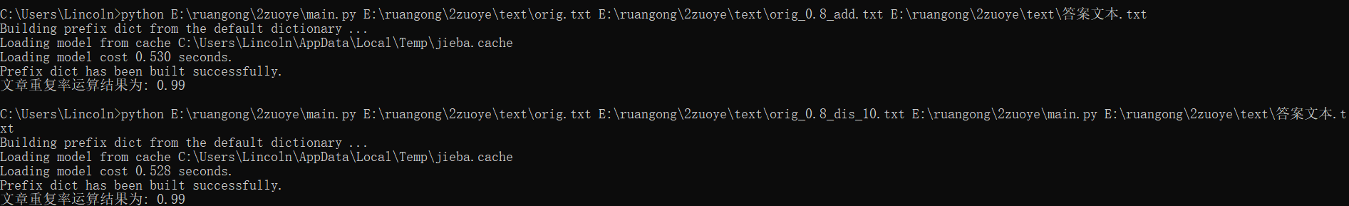 借助jieba库进行了分词和文本转向量的计算,同时使用了余弦相似度算法计算论文的重复率。其中算法的关键就是文本转向量的计算以及余弦相似度计算。