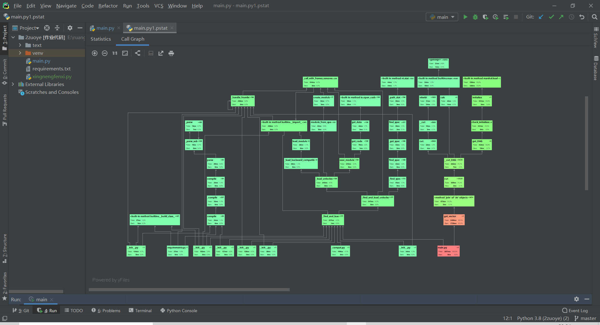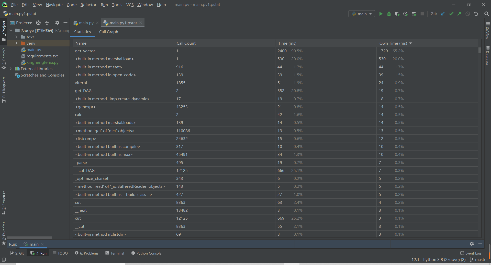 利用pyCharm自带的Profile工具对代码进行性能分析,得到如下时间耗费: