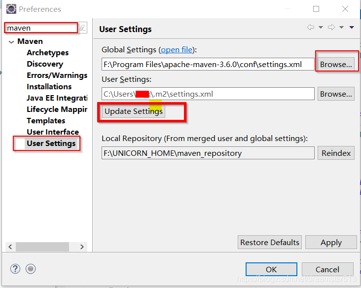 修改 Global Settings ,这里使用修改过本地仓库地址 和 url 镜像的settings.xml文件 。然后update Settings就可以了