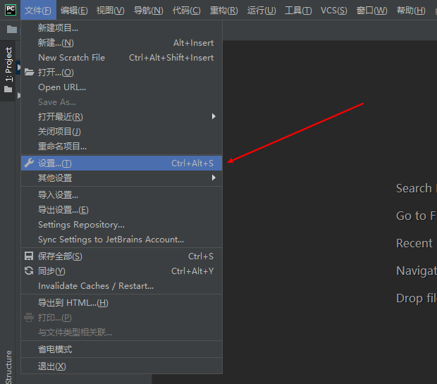 打开PyCharm新建一个项目,然后 进入系统界面。点击文件—设置。