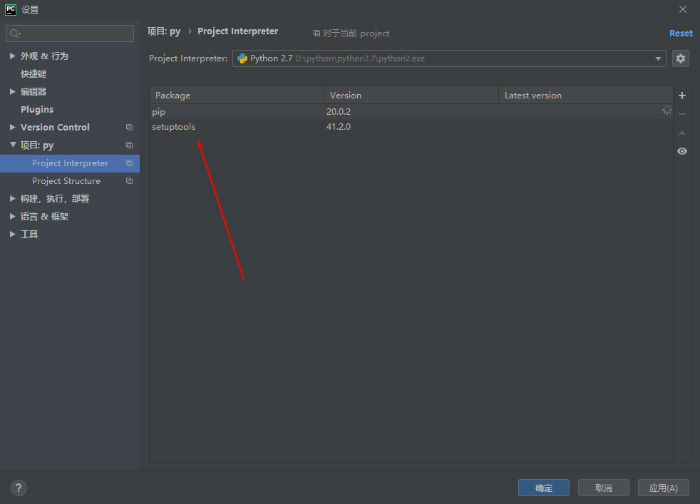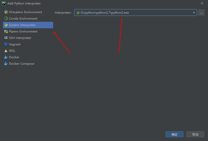 和上面一样,点击添加Python2的环境,值得注意的是,我们之前为了避免冲突,把