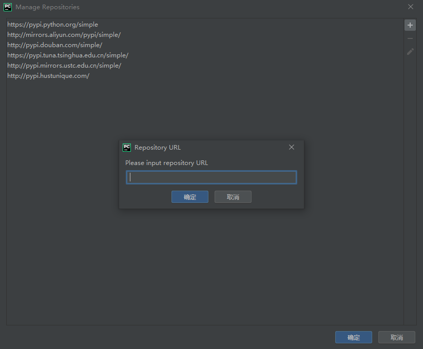 点击+号,把上面的pip源的URL链接一个个添加进去,最后点击确定,就完成了国内pip源的添加。