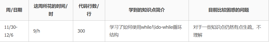 | 这个星期学习了white和do-while循环结构,但自己好像感觉有点没弄明白,做作业的时候就能感觉到吃力的感觉,与for循环不同,不知道明确的循环次数 | ||