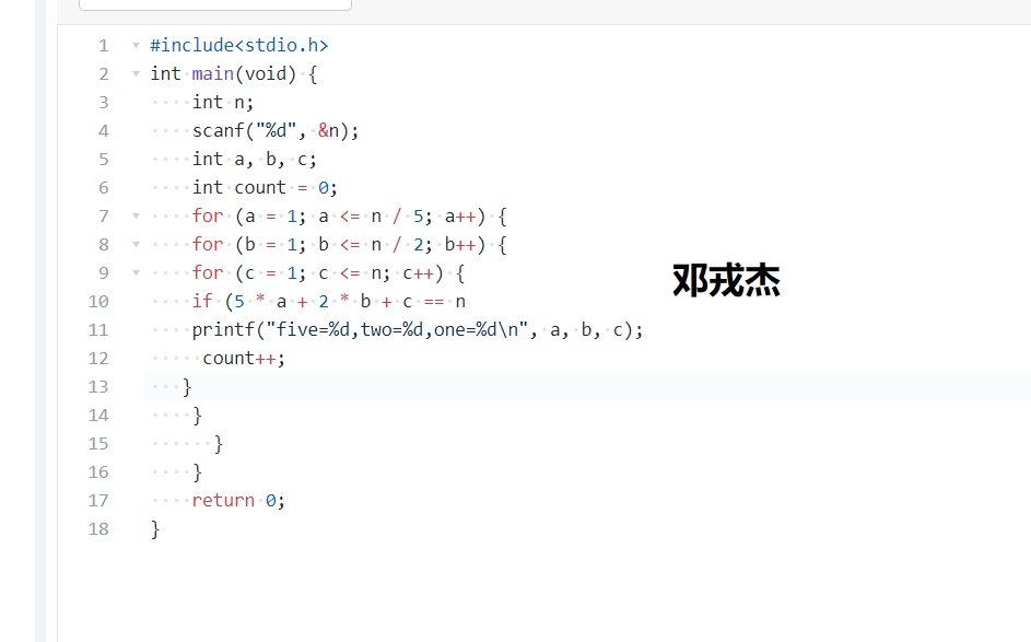 | 编程实现:输入我们需要兑换的金钱数,然后我们用这些面值5元,2元和1元的人民币来兑换,要求每一种面值都至少有1张,然后输出有多少种兑换方式。 |