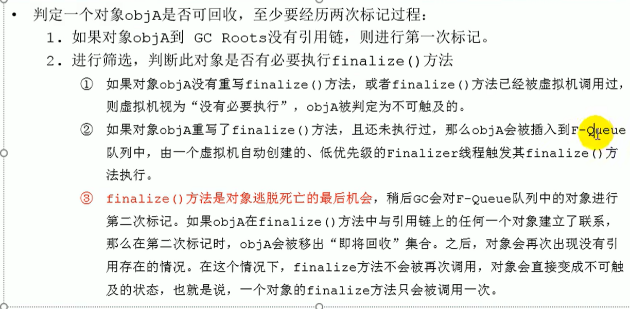 一个对象的finalize方法只会被调用一次 如果这一次调用它没有完成复活 就会死亡