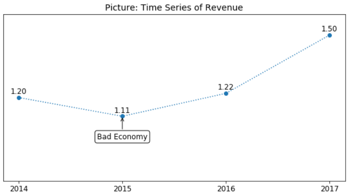 ax1.annotate('Bad Economy', xy=(time_series.index[1], time_series.loc[1, 'Revenue']),