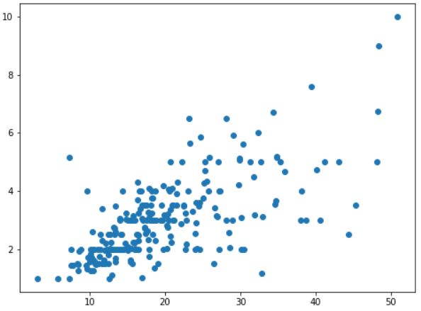 from matplotlib import pyplot as plt fig, ax1 = plt.subplots(1, 1, figsize=(8, 6)) ax1.scatter(tips['total_bill'], tips['tip'])