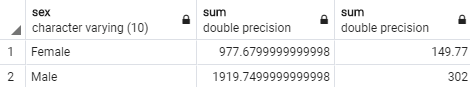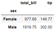 tips_nonesmoker = tips.query('smoker=="No"') tips_nonesmoker.groupby('sex')[['total_bill', 'tip']].sum()