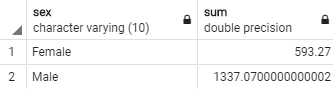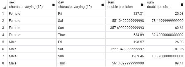 SELECT sex, "day", SUM(total_bill), SUM(tip) FROM tips GROUP BY sex, "day" ORDER BY sex, "day"