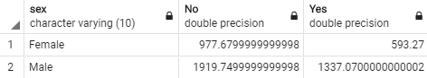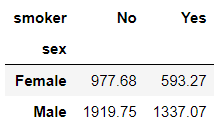 SELECT sex, SUM(CASE WHEN smoker='No' THEN total_bill END) AS "No", SUM(CASE WHEN smoker='Yes' THEN total_bill END) AS "Yes" FROM tips GROUP BY sex