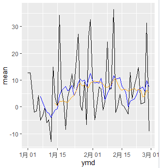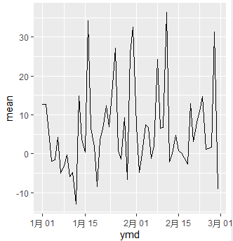 # A tibble: 59 x 2 ymd mean <date> <dbl> 1 2013-01-01 12.7 2 2013-01-02 12.7 3 2013-01-03 5.73 4 2013-01-04 -1.93 5 2013-01-05 -1.53 6 2013-01-06 4.24 7 2013-01-07 -4.95 8 2013-01-08 -3.23 9 2013-01-09 -0.264 10 2013-01-10 -5.90 # ... with 49 more rows