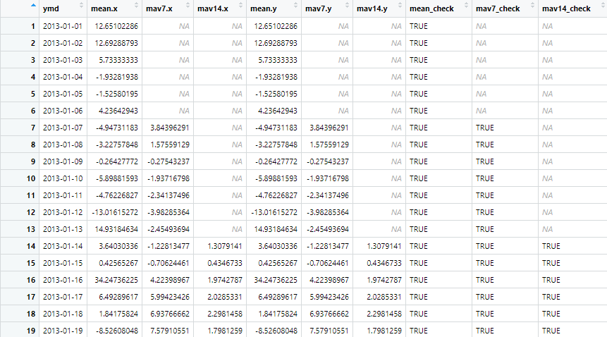 > example1 # A tibble: 59 x 4 ymd mean mav7 mav14 <date> <dbl> <dbl> <dbl> 1 2013-01-01 12.7 NA NA 2 2013-01-02 12.7 NA NA 3 2013-01-03 5.73 NA NA 4 2013-01-04 -1.93 NA NA 5 2013-01-05 -1.53 NA NA 6 2013-01-06 4.24 NA NA 7 2013-01-07 -4.95 3.84 NA 8 2013-01-08 -3.23 1.58 NA 9 2013-01-09 -0.264 -0.275 NA 10 2013-01-10 -5.90 -1.94 NA # ... with 49 more rows