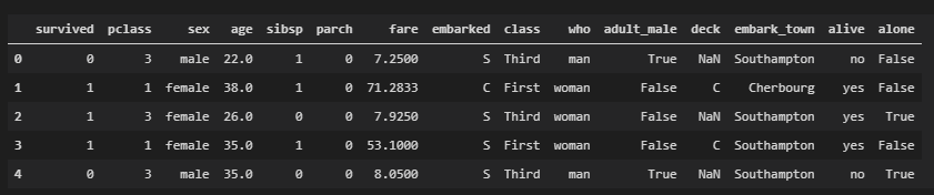 survived pclass sex age sibsp parch fare embarked class who adult_male deck embark_town alive alone